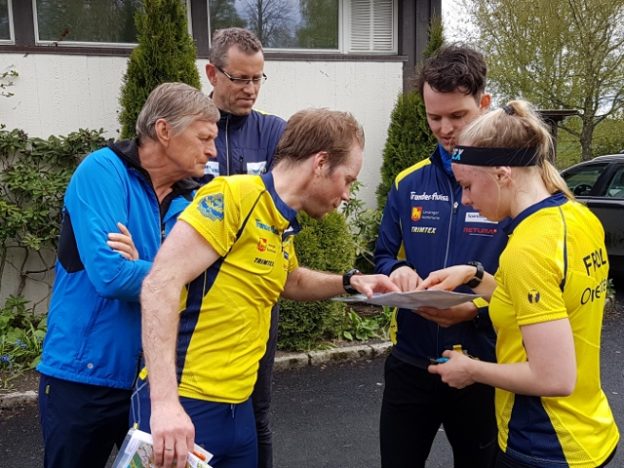 Lars og Maren diskuterer løypa med Harald Bakken, Gunnar Vatn og løypelegger Johan A Bjørnaas.