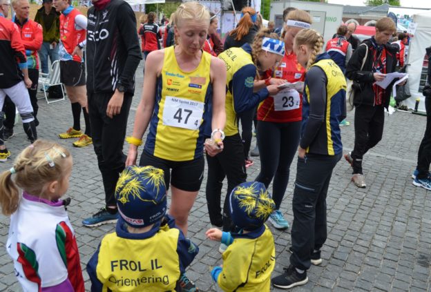 (Kine Sofie møtes av fanklubben etter målgang)