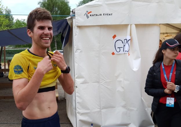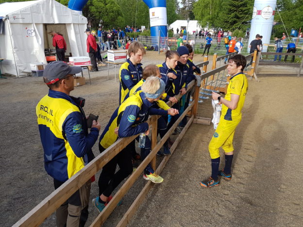 Martin og Johan Otto er i skogen. På storskjermen følges tetlagene nøye. Vi ser tydelig at Martin ikke tar sjanser, men orienterer på det sikre viset. Han lar junioren Eirik Langedal Breivik løpe for seg selv litt foran. Det er akkurat Nydalen vi konkurrerer med nå om å være Norges beste lag i stafetten. Så slår Martin om, og kommer inn på arena som første norske. Vi ligger nummer 3 igjen. Åttende beste etappetid er helt innafor. Det er fire minutter opp til andreplass….. Martin og vi er meget fornøyd.