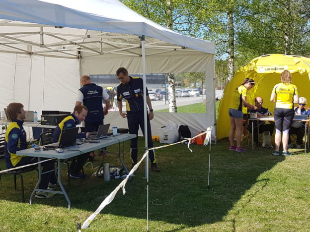 Jørgen, Øystein, Hans og Gunnar har full kontroll på det tekniske. Jonny og Marit på løpskontoret.