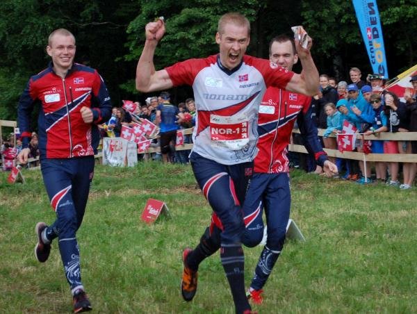 Eskil Kinneberg, Olav Lundanes og Magne Dæhlie løper inn til gull. Foto: NOF