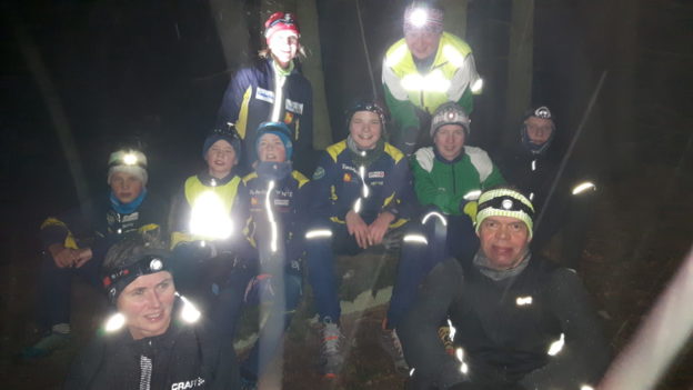 I Børsåsens flotte stisystem er det flott å løpe intervall. Hele 16 små og store var med i kveld. Trivelig at det var 2 fra Skøynar også med. På bildet er vi som sprang 4×4 minuttere. Mens 4 eldre gutter Lars, Hermann, Tobias og Paul løp 6 minuttere. De første snøfillene kom under treningen, så nå kan det være håp om skiføre snart. Vi har hatt flotte treningsforhold i Levanger i høst. I kveld tenkte vi litt på de to frolingene som løper under palmer og opp og ned skipsdekk