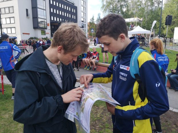 Tobias diskuterer dagens løype med trener Jo F Indgaard.