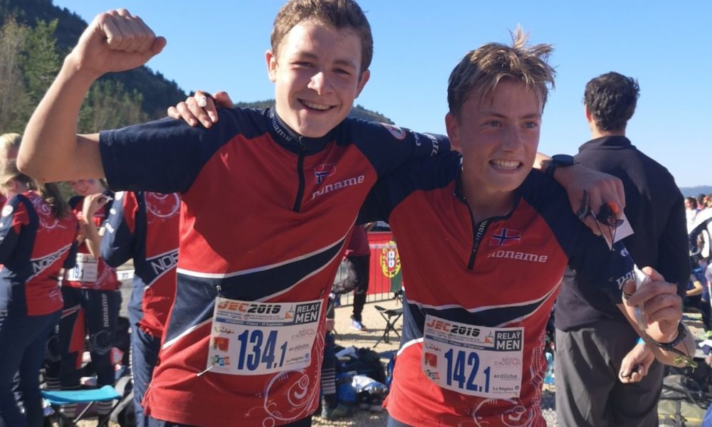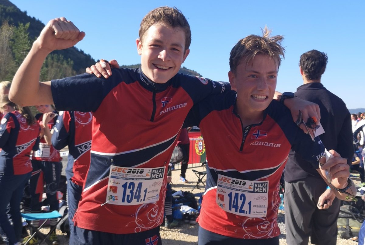 På bildet jubler Tobias sammen med jevnaldrende Cornelius Bjørk som løp første etappe for Norges 4.lag. Cornelius vekslet som nummer 4 etter første etappe, 14 sekunder foran Tobias.