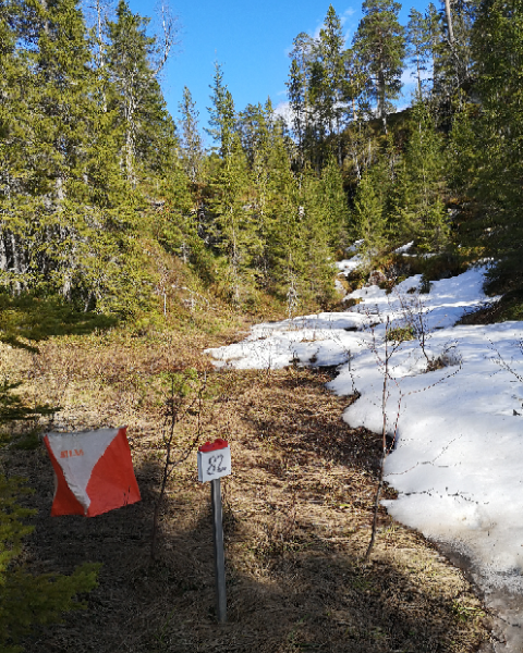 Mellom post 4 og 5 på N-løypa er det merket mellom postene med røde/hvite plastband. Dette tilsvarer også første del av strekk mellom post 6 og 7 på C2 løypa.