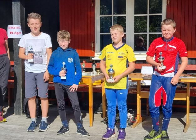 H 11-12 er ikke KM-klasse. Men Brage Reinås fikk velfortjent premie for sin 3.plass i klassen. F.v. Gustav Standal, Stj.Blink, Leo Benjamin Morgan, Malvik IL, Brage Reinås, Frol og Erik Rånes Verdal OK
