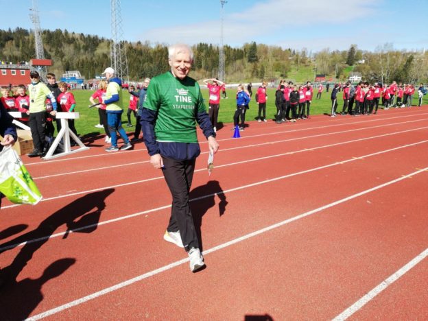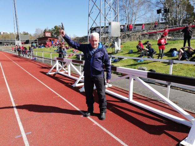 Skal tro om det er noen i Norges land som har en starter med lengre ansiennitet enn Jostein Moksnes. Han tok starterkurs i 1968! Her er han i aksjon under Tinestafetten som ble arrangert på Moan 10. mai.