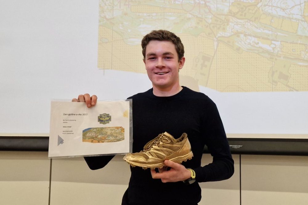 “Den gyldne O-sko” – klubbens høyeste hedersbevisning ble tildelt Tobias for gull og sølv i jr. VM.