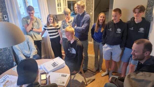 Lena Alstad forteller om god stemning i flokken. Seniorløperne tar seg godt av ungdommene, lager middag og kommer med mange gode råd foran stafetten. Som her på fredagens løpermøte: