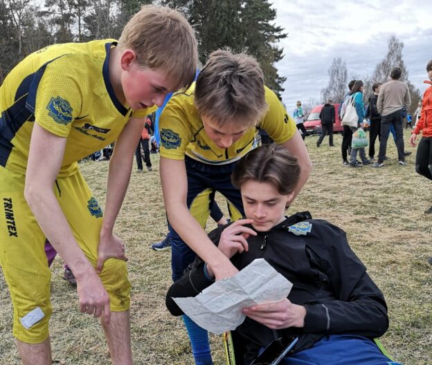 Ludvig, Sondre og Jonas diskuterer dagens løype.