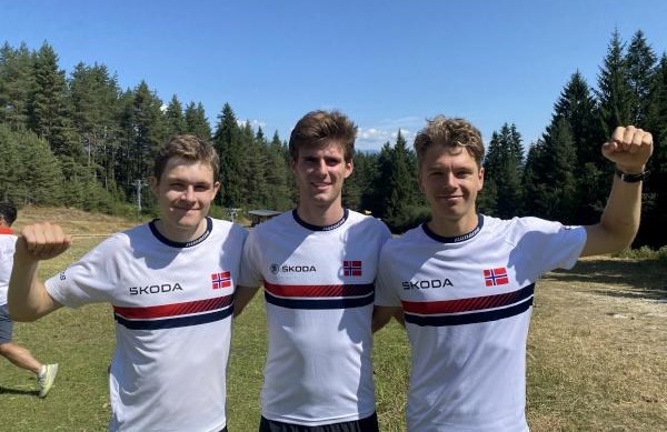 Med Tobias sin sterke opphenting på slutten av stafetten er det klart at formen stadig er god. Og nå gleder han seg stort til høstsesongen. Spesielt NM-uka i Verdal. (Bilde: Norges førstelag med f.h. Oskar Spets Storhov, Kornelius Kriszat-Løvfald og Tobias Alstad. Foto: Rotem Yasur/Orientering.no)