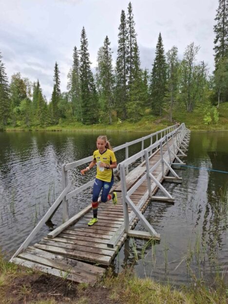 Solveig på vei til målgang over holmgangen og sikret kretsmesterskapet i D13-14!