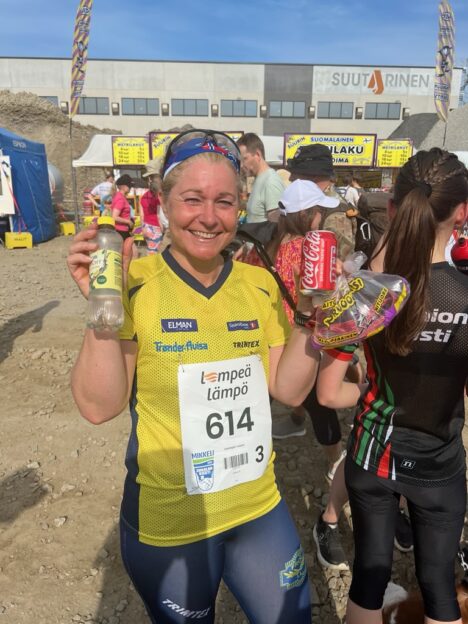 Damelaget vårt i Jukola greide til slutt å bli nummer 181 av de 1475 startende lagene. Gøril dro til med å vinne førsteetappen, mens ungjenta Solveig Skoglund Leithe (bildet under) imponerte med å løpe sin 9 kilometer lange etappe på en solid måte.
