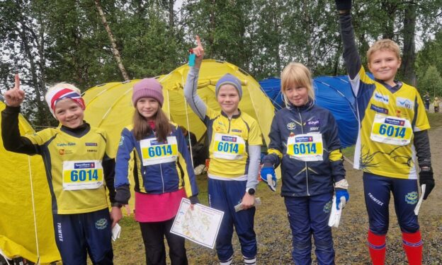 For de yngre løperne ble det arrangert lagkonkurranser. Der hadde vi med disse to lagene. F.v. Sigurd, Emil, Otelie, Live Marie og Tiril.